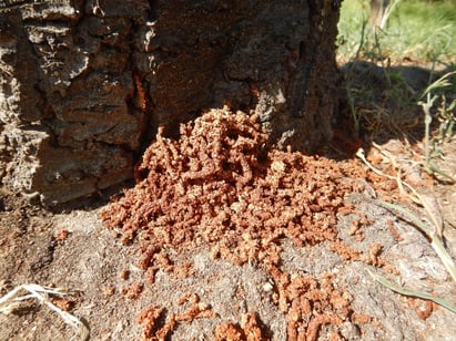 カミキリムシの幼虫が木に入っている場合、株元に木くずが散らかるのが特徴です。特にクビアカツヤカミキリは独特なフラスと呼ばれる木くずを出します。